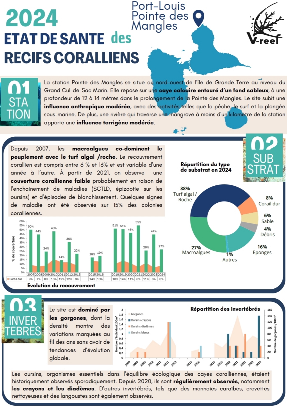 Pour connaître le dernier rapport d’état de santé des récifs de Guadeloupe, téléchargez l’extrait du rapport IFRECOR correspondant ci-dessous